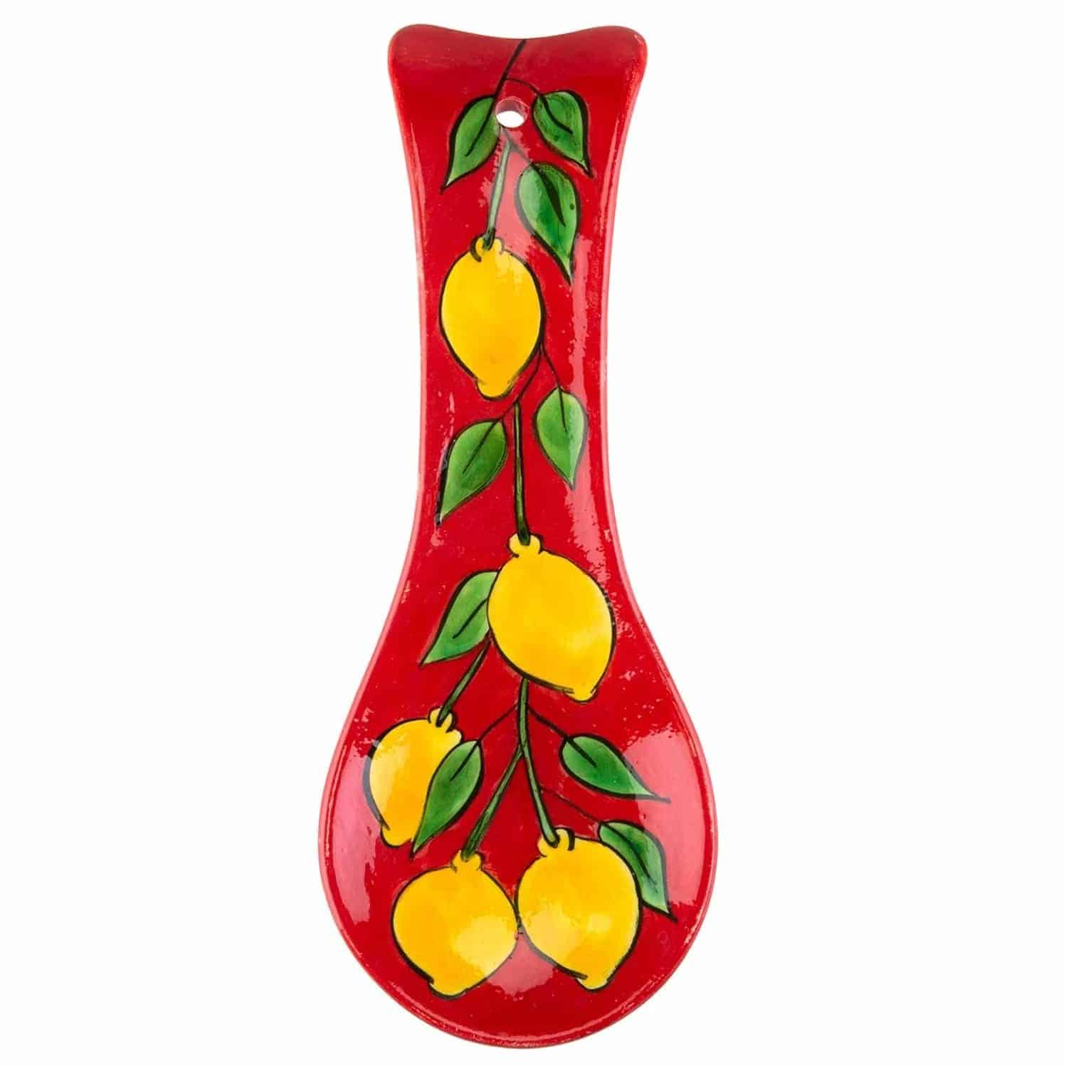 A handmade spoon holder from the Amalfi Coast collection, featuring a red base with vibrant lemon patterns.