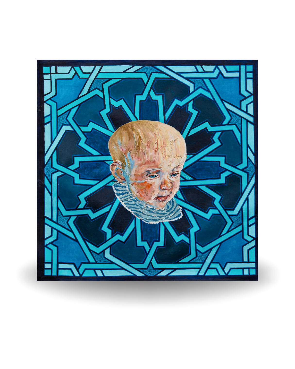 Blue Baby places innocence at the center of a geometric world. The child’s face emerges gently from a deep, structured blue field inspired by Seljuk ceiling ornamentation, where pattern carries memory and cultural time. The softness of new life meets the architecture of heritage.
