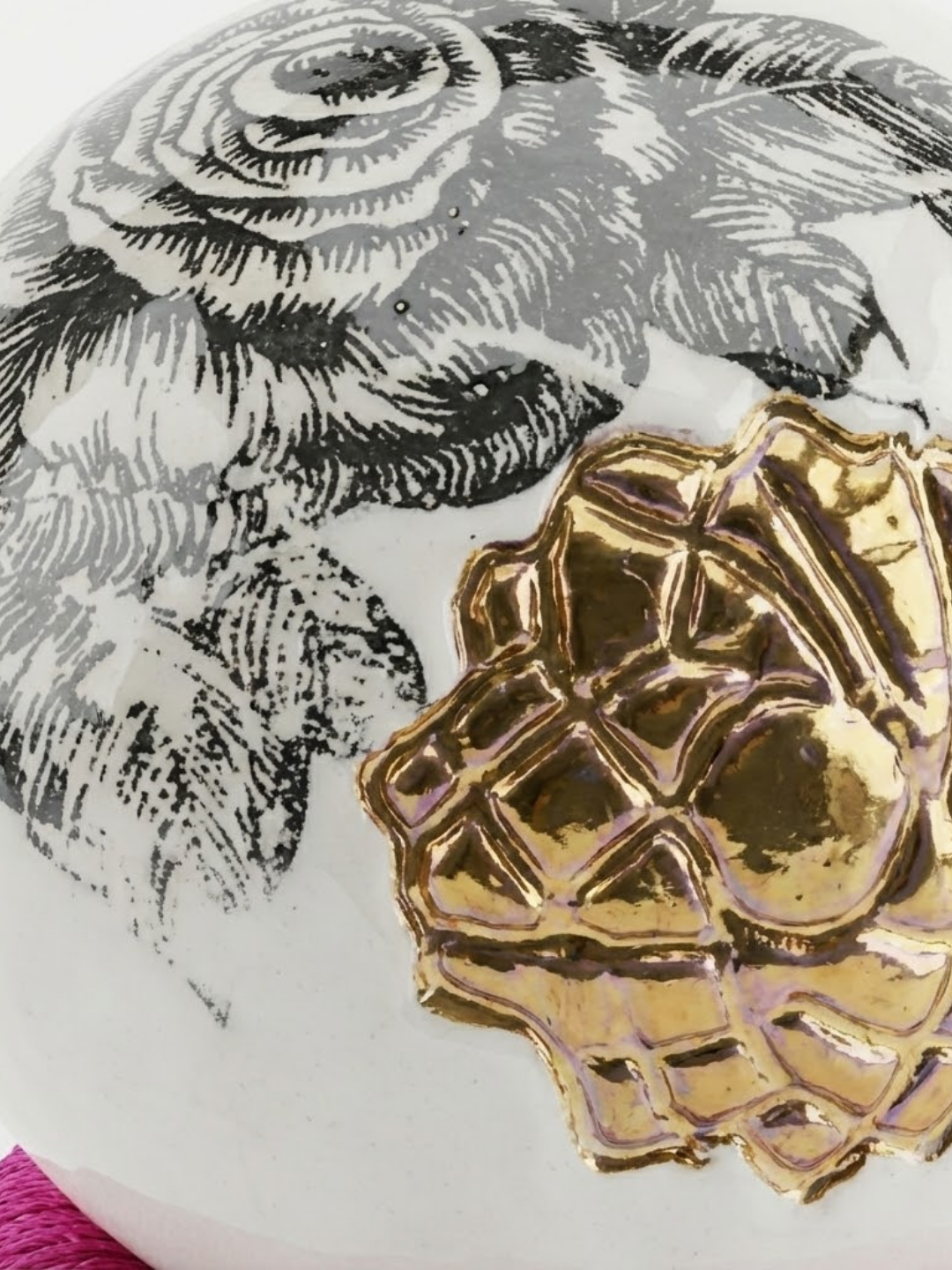 This fully glazed ceramic object is enriched with 24k gold detailing and rests on a wooden base wrapped in silk thread. Designed as a contemplative decor piece, it brings intention, stillness, and elevation into any space.