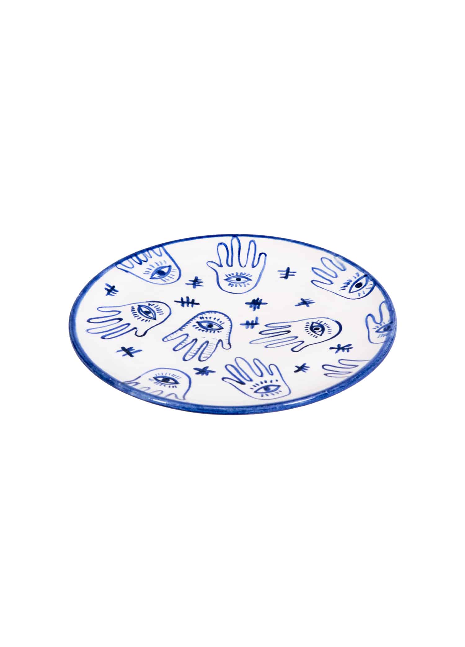 A handmade ceramic dessert plate from the Inner Eye collection, featuring a repeating (Fatma’s Hand) motif.