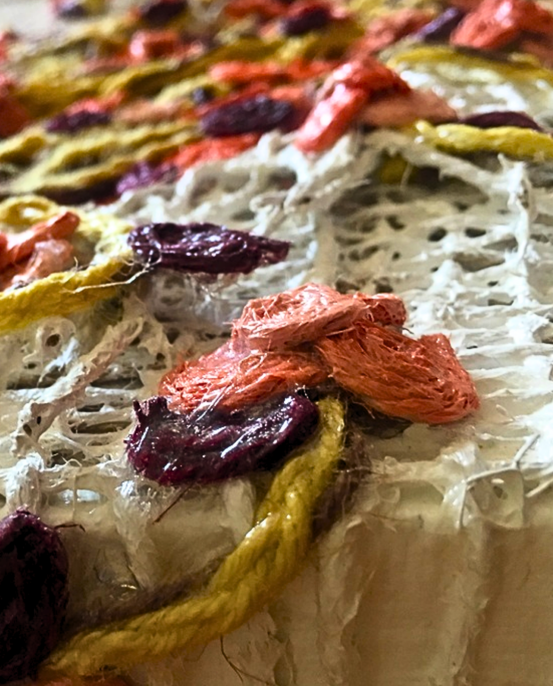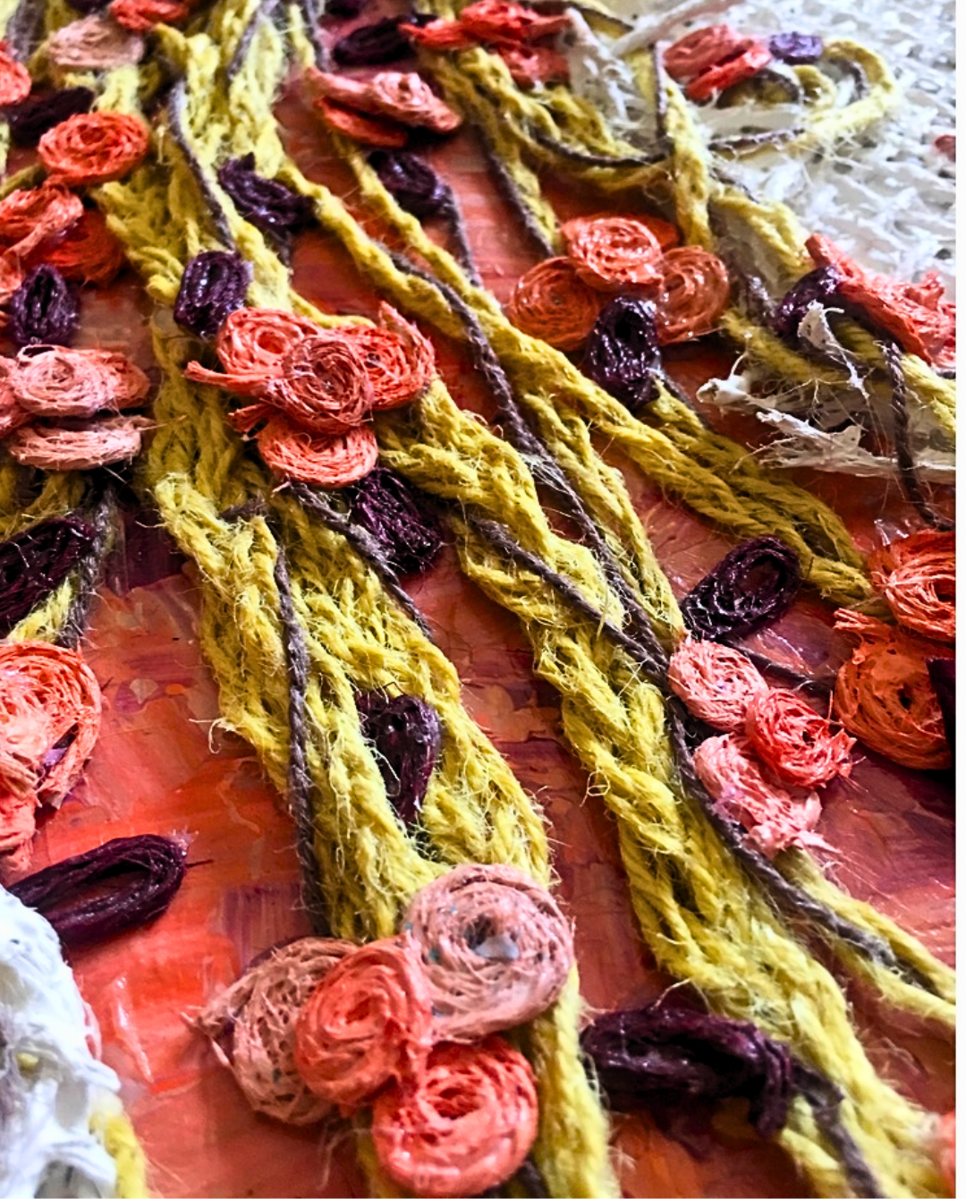 Braided strands of jute and wool climb across a pale surface, their vivid tones of coral and mustard forming organic paths that echo Elif Kemahlıoğlu’s hyperfocused study of growth and renewal.