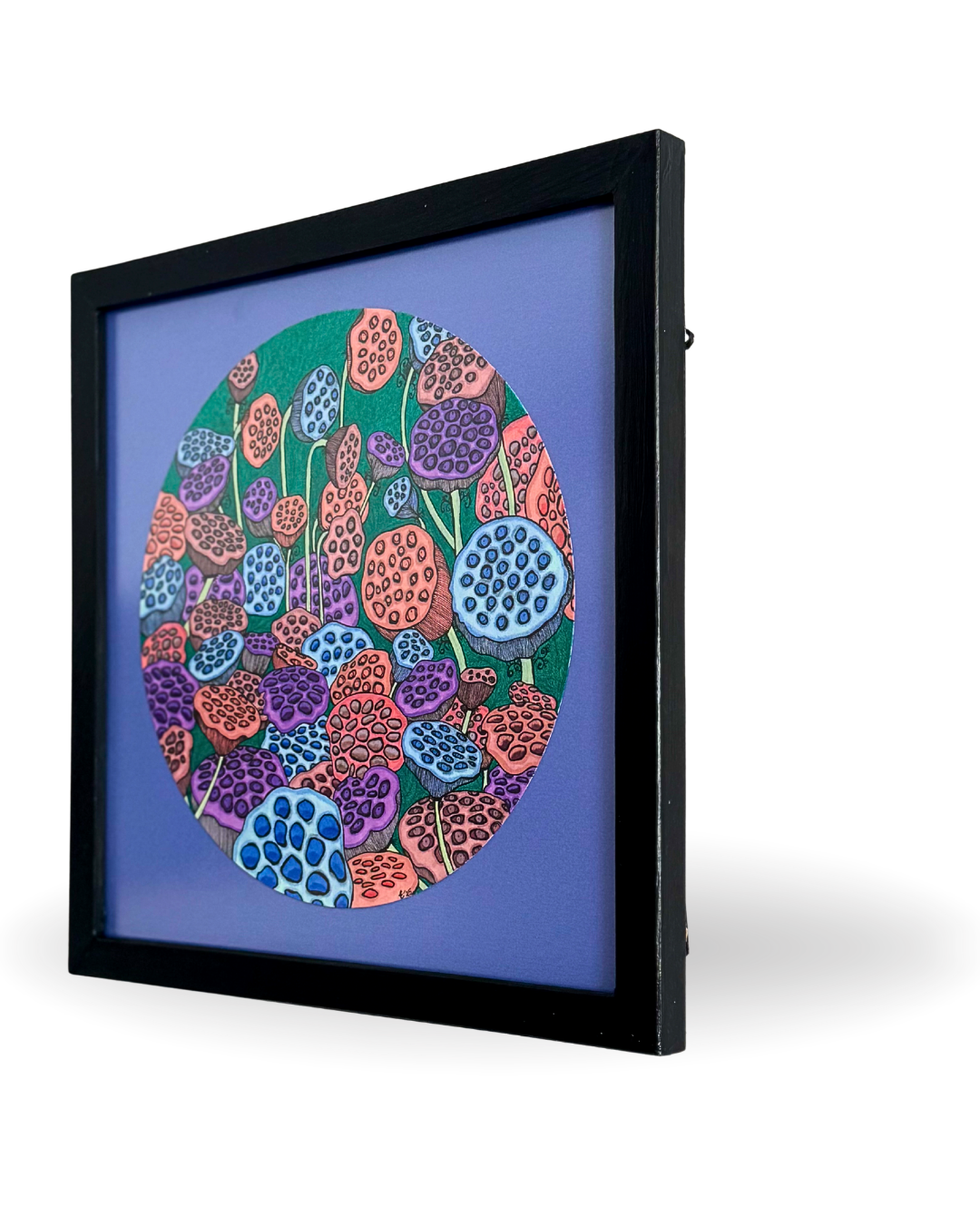 Lotus Pods celebrates the hypnotic geometry and enduring symbolism of the lotus — a flower that grows from the depths of the mud into radiant bloom. Through vivid hues and layered mark-making, Elif Kemahlıoğlu transforms the organic structure of the lotus seedpod into a dreamlike botanical landscape.