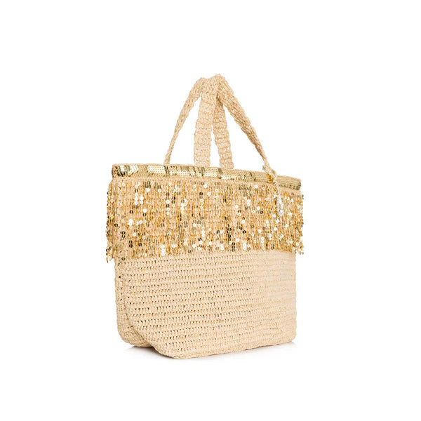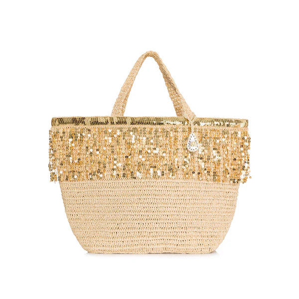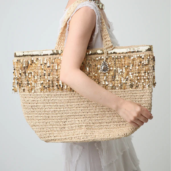 Natural color raffia maxi tote bag with gold sequin trim