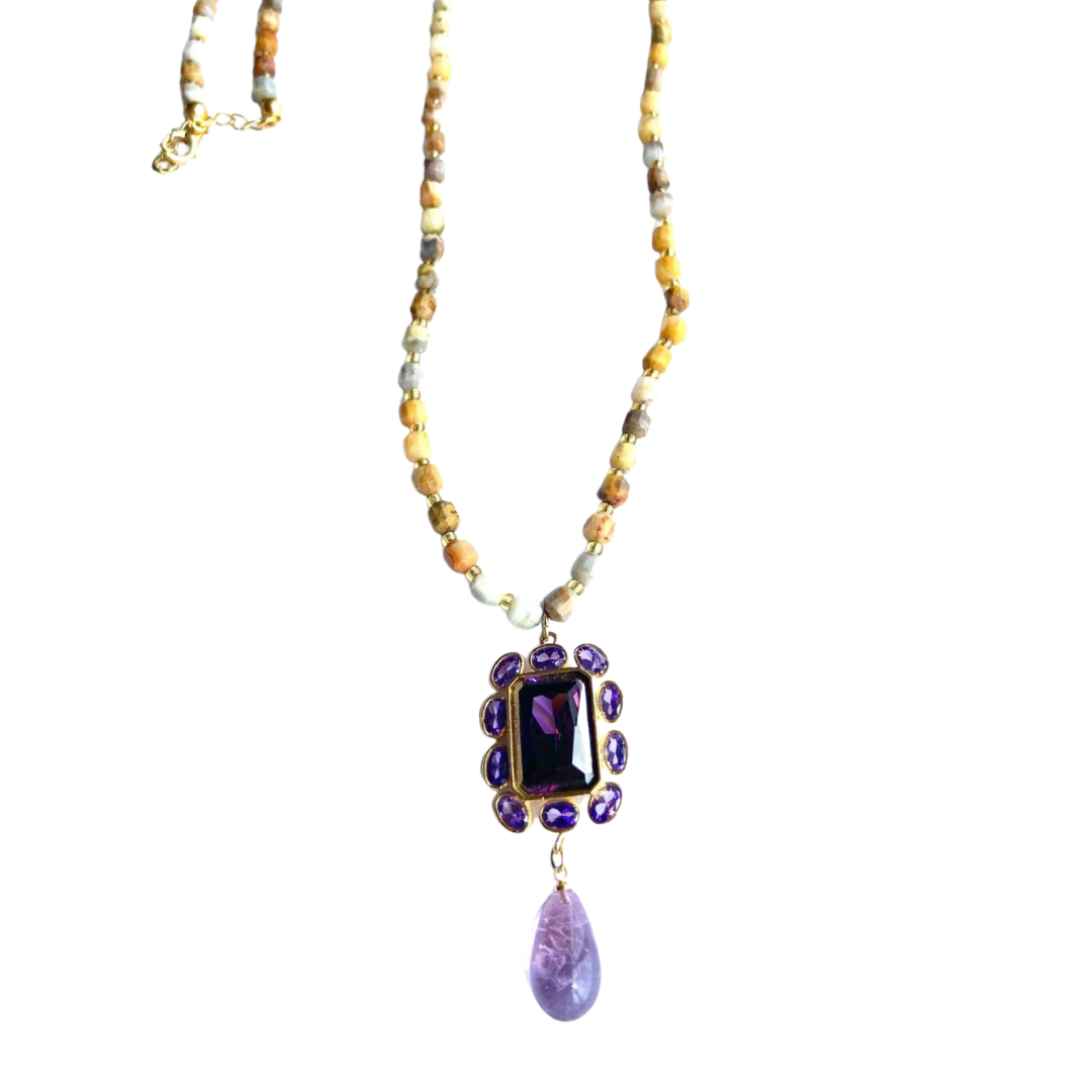 Kahve jade taşı & mor zirkon uçlu kolye
