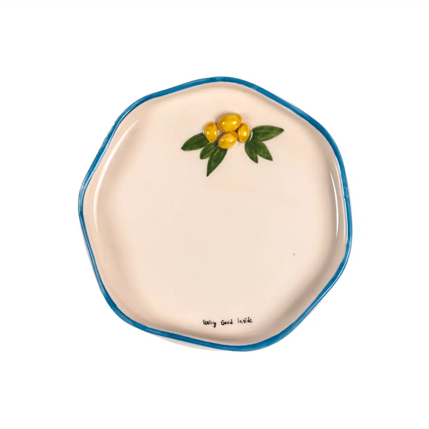 A cheerful 3D mini plate from the Petite collection, decorated with lively lemon motifs in hand-painted relief.
