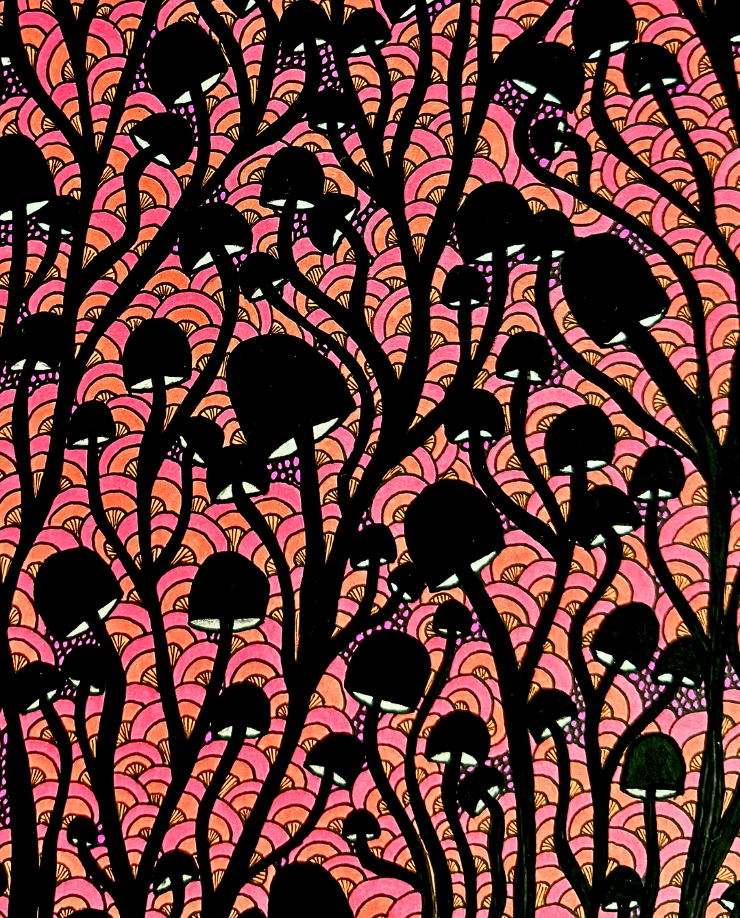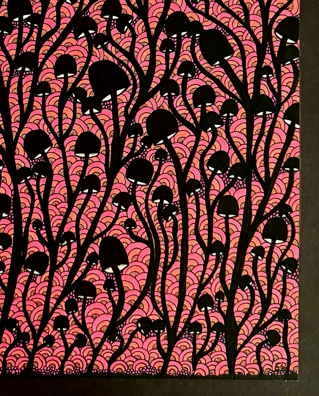 With intricate repetition and organic rhythm, the piece echoes the intelligence of mycelial networks, depicting how destruction and renewal coexist within the same breath of nature.