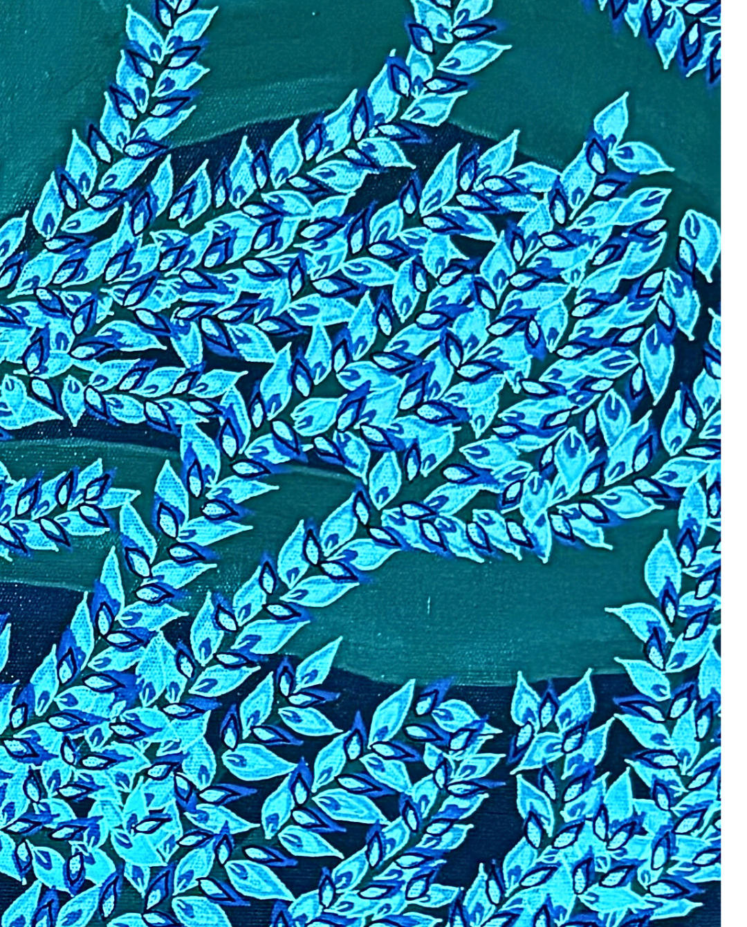 The densely patterned leaves and reflective surfaces evoke coded beauty, an encrypted forest that hums with quiet awareness.