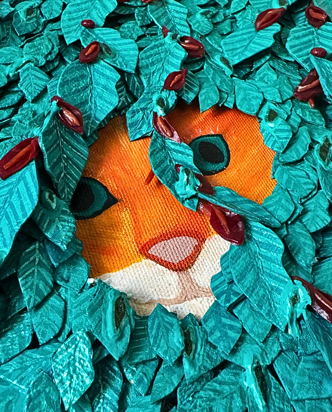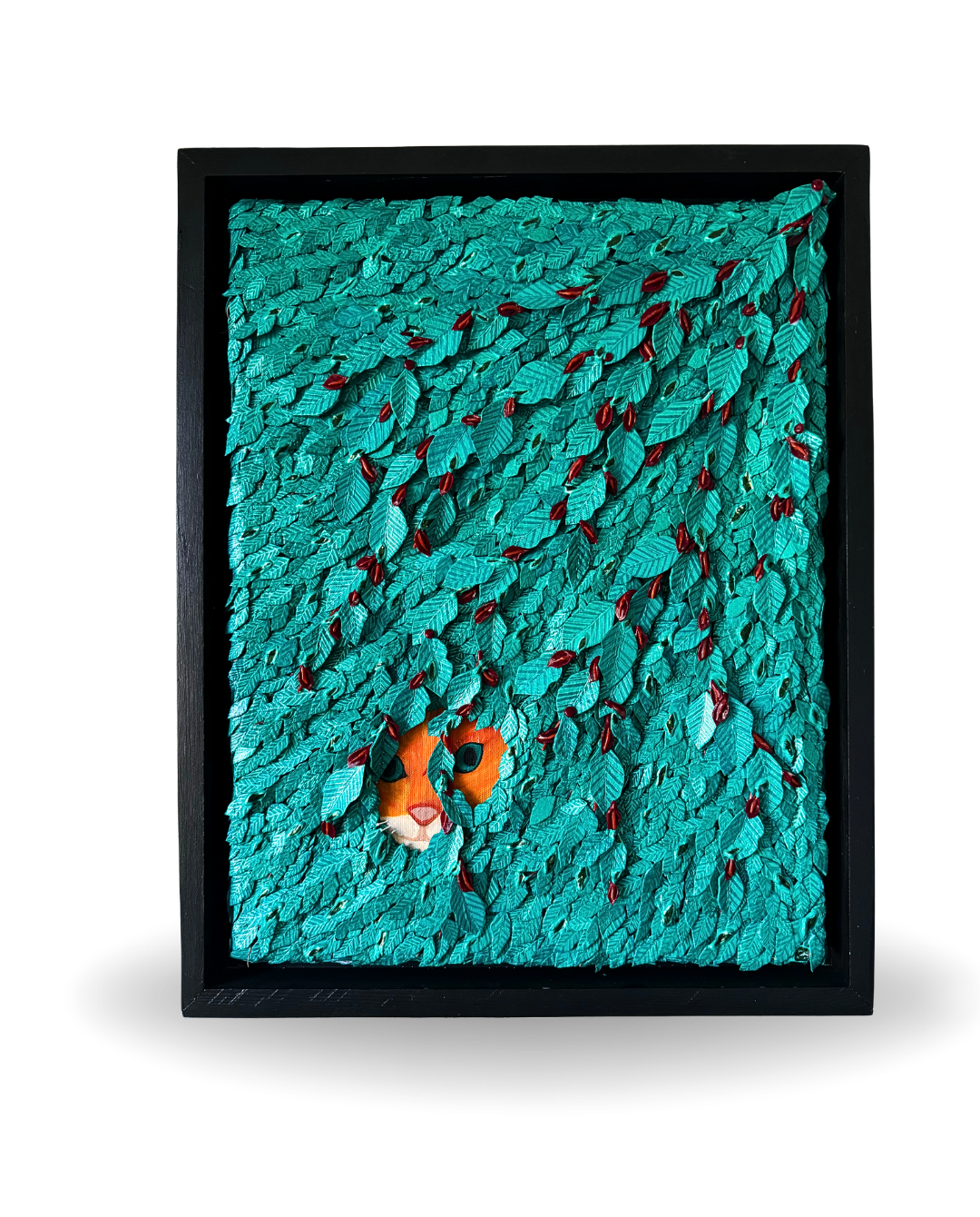 Hidden beneath a dense curtain of hand-cut leaves, a cat’s gaze emerges—curious, silent, and all-seeing. “The Cat” is a layered meditation on visibility, observation, and the quiet magic of stillness.