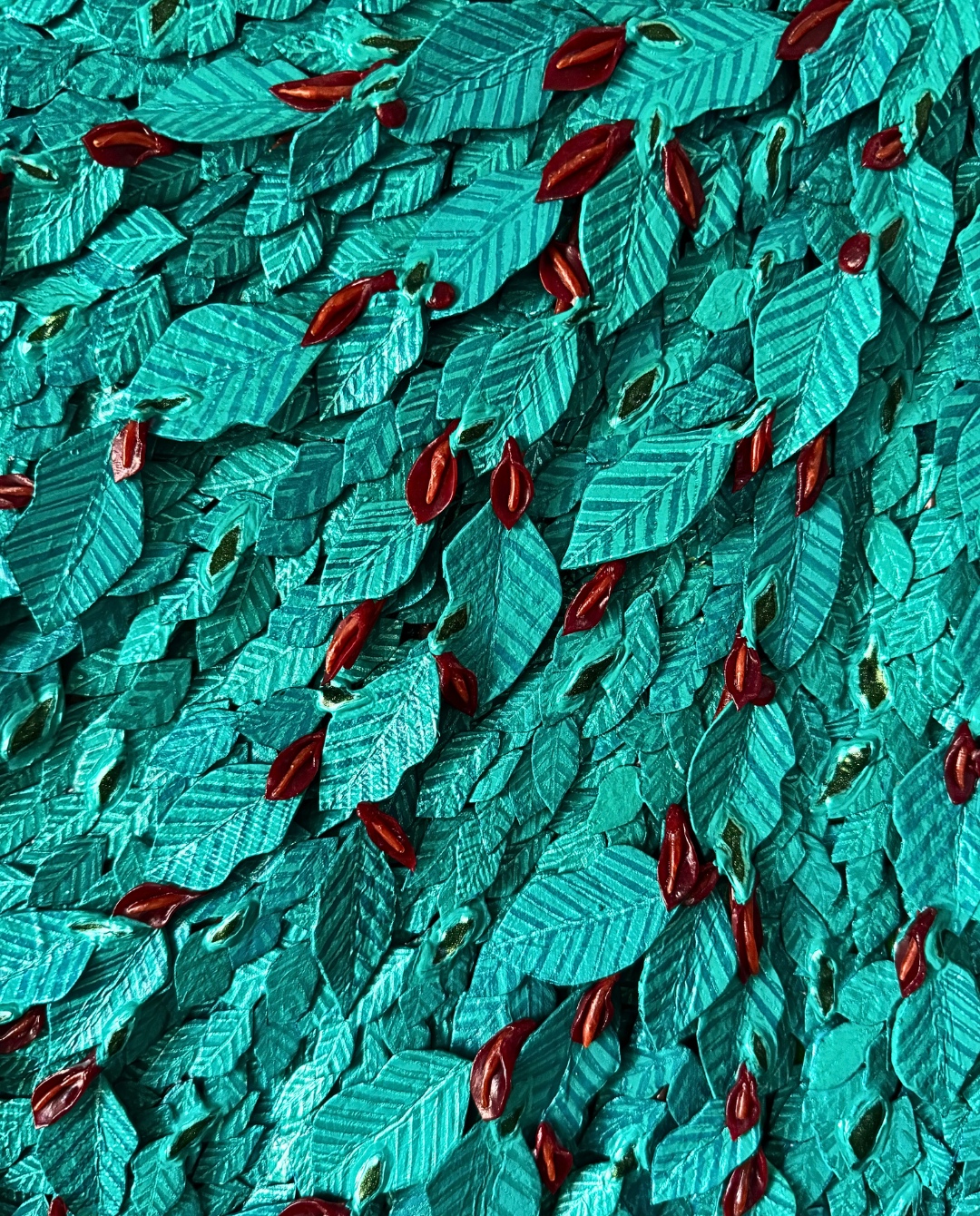 Every leaf is handmade from recycled paper, shaped and painted to form a living texture that feels both wild and tender.