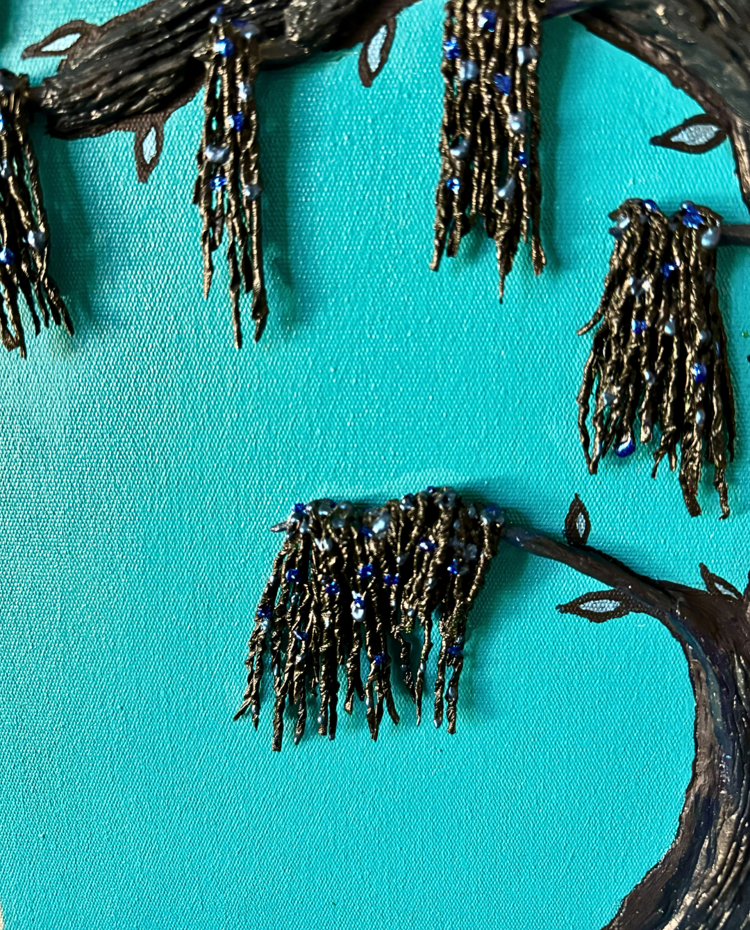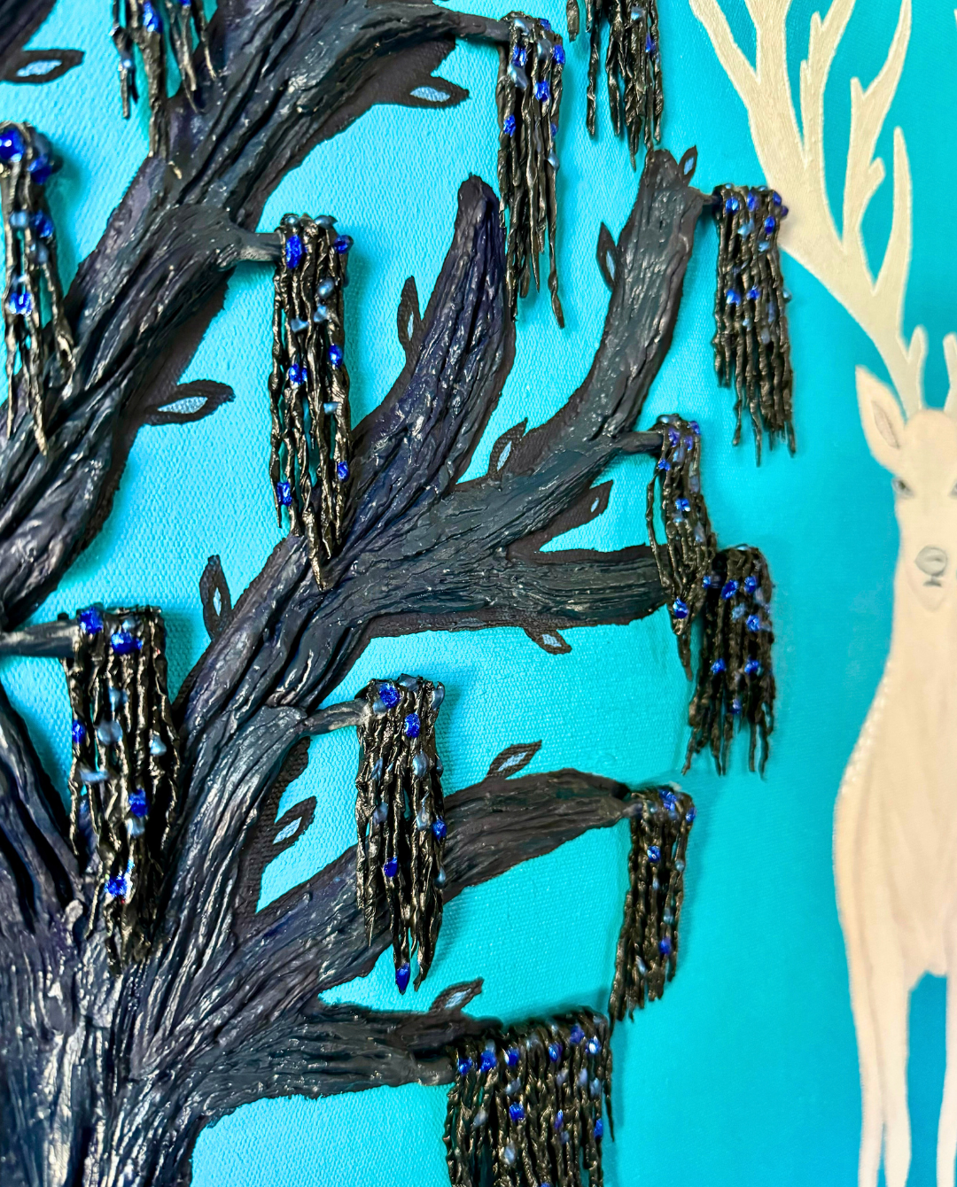 Drawing from forest folklore and the symbolism of the white stag, she blends organic materials with luminous color to create a scene that feels both spiritual and tactile. Every mushroom, glint, and shadow becomes part of a larger rhythm—nature’s quiet, timeless whisper.