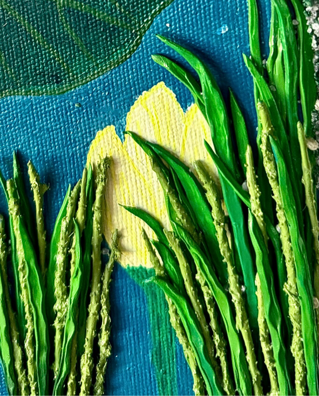 Elif builds the scene in layers—clay reeds, moss, and paint—so the surface feels alive, like a pond breathing. It’s a love note to nature’s improbable collaborations and the beauty we notice when we truly look.