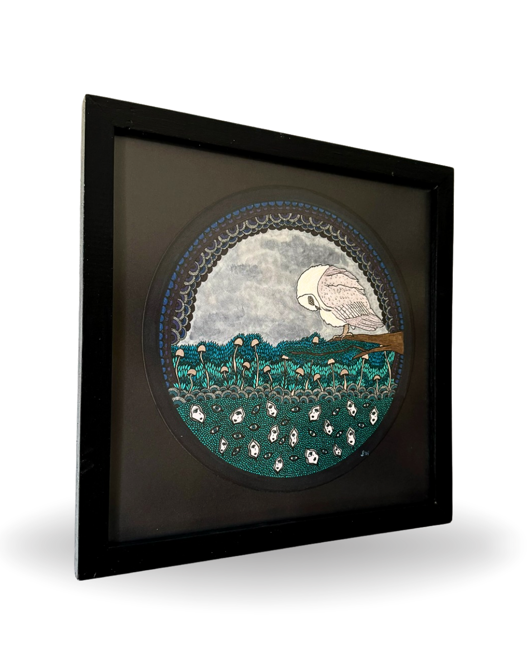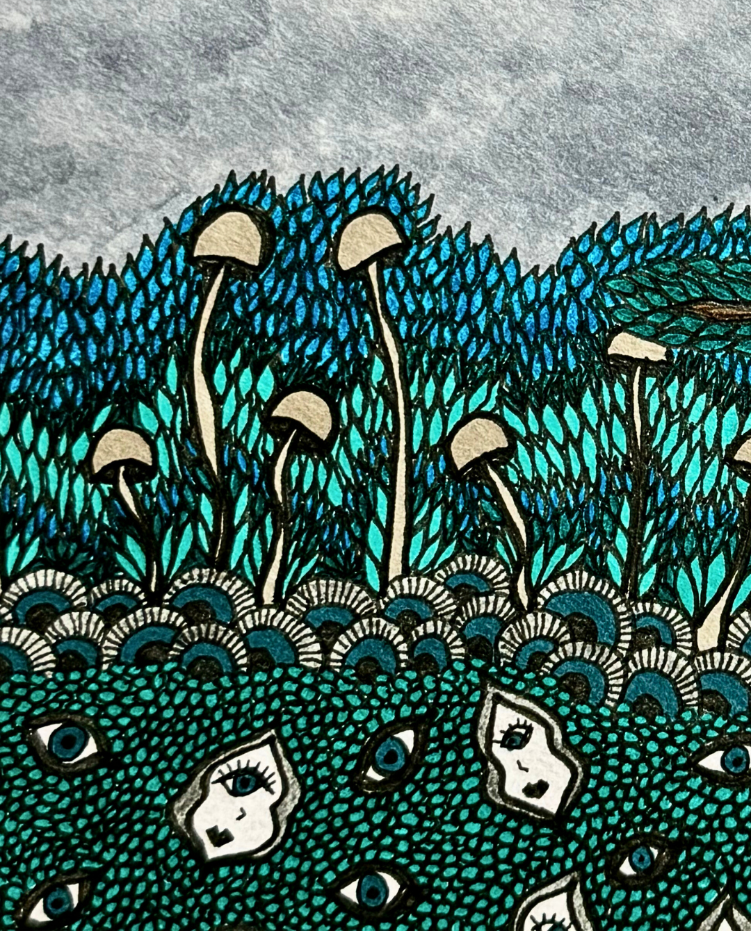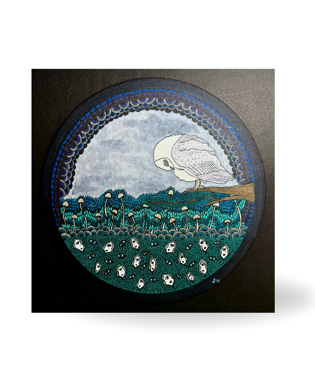 The intricate mandala-like border echoes the cycles of awareness, while the mushrooms and eyes beneath suggest layers of consciousness, memory, and transformation hidden in nature’s depths.