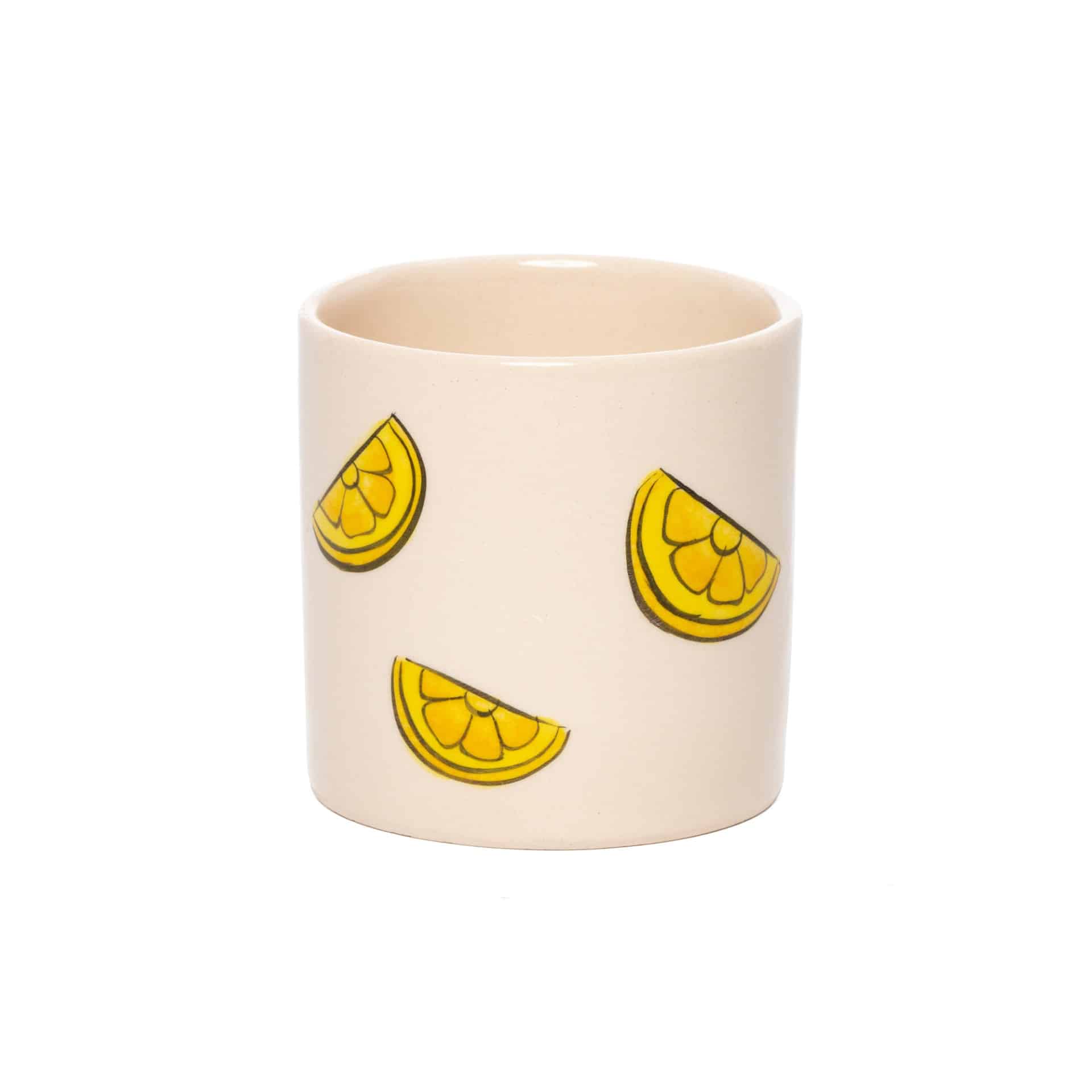 A handmade ceramic mug from the Amalfi Coast collection, featuring a bold three-slice lemon motif.